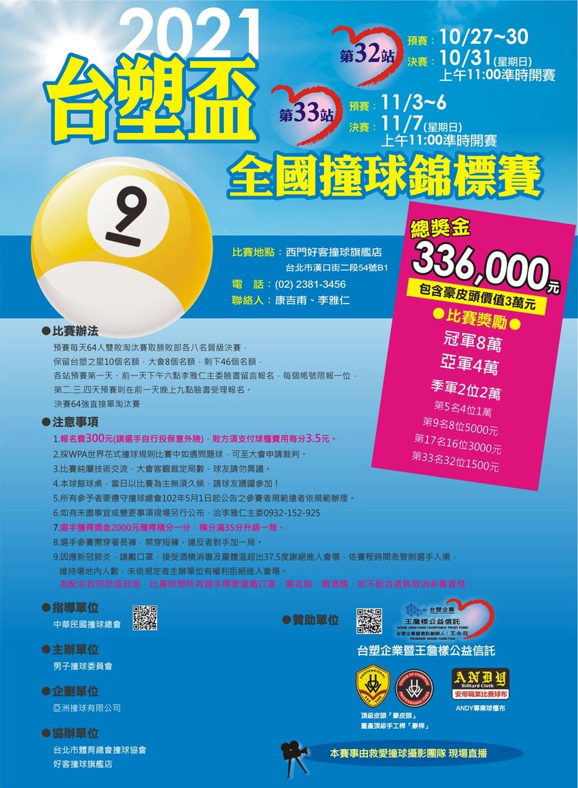 2021年第一站(「第32站」) 預賽日期:2021年10月27日(星期三)至30日(星期六)上午11:00 決賽日期:2021年10月31日(星期日)上午11:00 比賽地點:西門好客撞球旗艦店(台北市萬華區漢口街二段54號B1) 直播網址:https://www.facebook.com/justbilliards/live_videos/?ref=page_internal